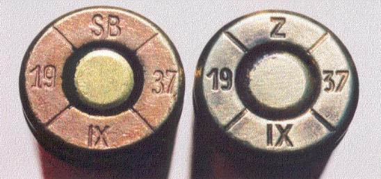 Cartridge Headstamps (markings stamped on the head / base of the cartridge). Segmented headstamps for two 7.92mm (7.92x57) rimless Mauser cartridges made in Czechoslovakia. Both these impressed headstamps show the same date of production (9th month of the year 1937) but different manufacturer marks (at left - "Sellier & Bellot", at right - "Zbrojovka Brno / Bystrica").