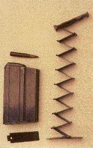 ZB - 30 LMG disassembled box magazine. With rimless ammunition (7.92 X 57mm) this is a straight-sided box. The magazine holds 20 rounds. Note the 7.92mm cartridge by the magazine feed lips.